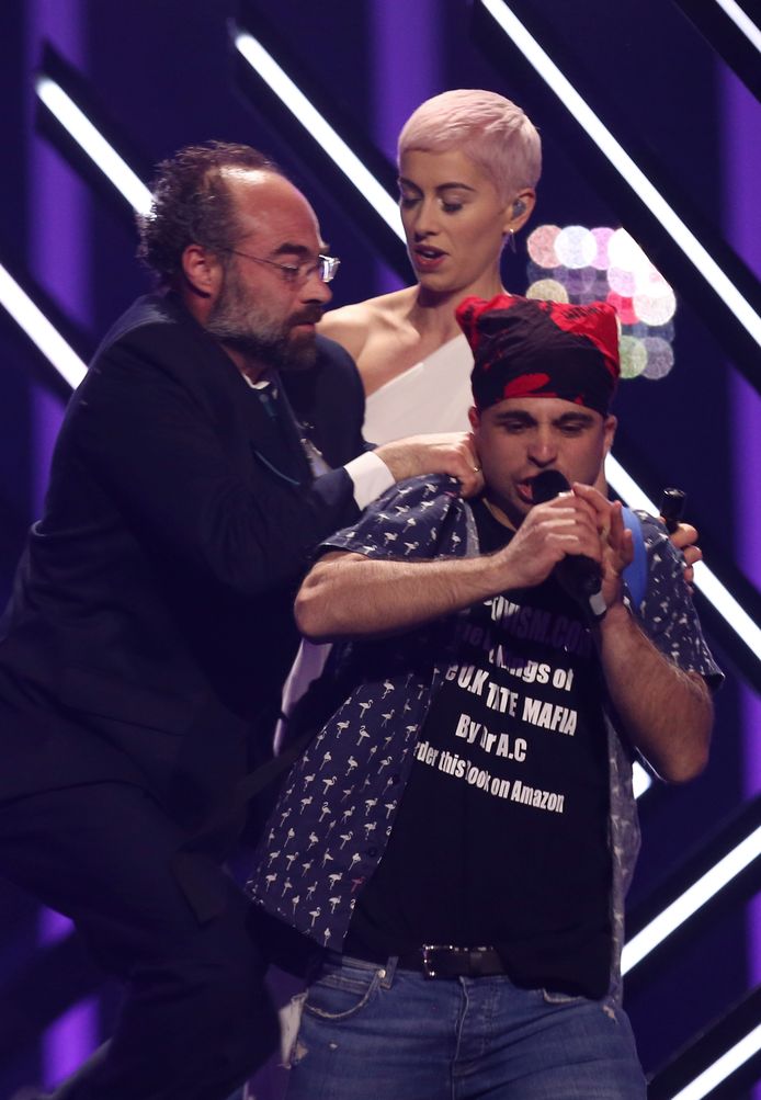 Video Podiumbestormer Pakt Micro Af Van Britse Surie Tijdens Eurovisiesongfestival Muziek Hln Be
